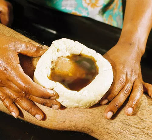• A reservoir on the knee joint is made with black gram dough, on which the whole process takes place.